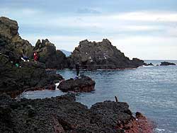| ↑私の釣り座から左方向。良く見えないかもしれないが、5名の釣り師がいる。このポイントは北海道を見ながらの釣りになる。 | ↑同じく私の釣り座から右の方向。中央に一人居るが、この先は行き止まり。その氏が本日、唯一の一枚を上げて、意気揚々と昼過ぎに退却しました。 | ↑時折、来る波。ウネリには常に注目し、満潮の時刻なども頭に入れて低い磯場に入らないと痛い目に遭う。この判断は紙一重でもある。 |
