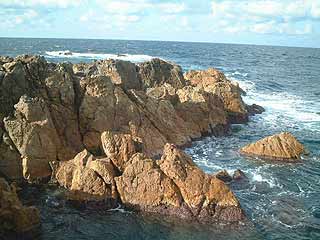 ↑このロープ、しばらく前には無かった。かつて岩と岩の間をジャンプして渡ってたため、この先のポイントをハネ岩(右の写真:一級ポイント)と呼んでました。でも跳べそうで跳べない距離なんですよね。約1mぐらいでしょうか?ヘタすりゃ、海にボッチャンです、勇気要りますよ。いつの間にロープを渡したのでしょうか? | |