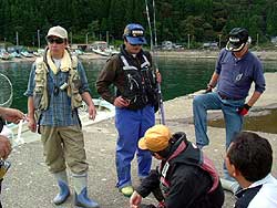 | 20日は前日とうって変わって、好天となった。午前3時半、コテージを出発し、約40分ほど先の平舘村石崎漁港を目指す。漁港では、いつもお世話になっている須藤船長の他に、岡崎船長がいた。予め、決めておいた船割りに従って、二つのグループに分散。 須藤船にはリュウ、ミキ、トメ、シブ、コマツの5名、岡崎船にはケン、リョウイチ、キャス、あすぱむの4名が乗船。まさひゃろ氏は無念の居残り。 午前5時前、出港。須藤船が暗闇の中、ぐんぐん進み、いつのまにか見失う。我が岡崎船は先日の台風18号で1基のエンジンにトラブルが起こり、残る1基での片肺航海となり、スピードを出せず、水深26mの浅場をポイントに決めて釣行スタート。潮の流れは緩い。底取りも難無く行なえ、しかも船の揺れが全く気にならないことから、各選手ともヤル気に火が付いた。 さて、ウチの船長がおかしい。移動の合図が出て、仕掛けを上げ、準備をしていたら、海に向かって「ゲッ!」とコマセを捲いた。ほへ?何?いまの?船酔い?まさか? でも具合が悪そうだ。ベテラン船長でも船酔いすることはあるかもしんないなぁ〜と思いつつ、気になっているとリョウイチさんが「悪い弁当でも食べたらしく、食あたりしたらしい」という。なるへそ。可哀想だが、船首で寝てて貰おう。 まもなくして須藤船が戻ってきて、互いの釣果を確認しあうと、なぁ〜んと、向こうでは2〜3枚と芳しくないという答え。我が船は既に9枚。大きく水を開けた格好で気分は悪くない。だが、もう少し大きい60オーバーのサイズが欲しいところ。悲しいことに、船中、まだ釣果が無いのは、この私だけ。しかも、前夜、馬名「アスパムソックス」に異議が唱えられ「スッポヌケアスパム」にすべきだと提案が…。 と、そんな時、近くで仲良く釣っていた須藤船の動きが慌ただしくなった。パパラッチコマツさんの竿が魅力的な弧を描いているではないか。サイズはかなりありそうだ。前日の伊達予選に引き続き、今日も主役なのか?大きい真鯛に違いない、きっと。 我が船とは次第に距離が離れてしまい、しばらく忘れかけていたが、遠目で見ると、コマツさんが人の集まっている船首とは逆のトモ(船尾)でペットボトルの中身をグビグビ飲み干していた。バラしたか?と思いきや、竿を握っていたのはTOMEさんだった。あまりの強い引きに戦闘意欲を失ったコマツさんが、願い出たモノだという。そのTOMEさんもギブアップしたか、今度はリュウちゃんへ、はたまた、SIBUさんへと渡り、怪物の手応えをそれぞれが体感する美しい竿のバトンリレーが展開された。 (下に続く) |