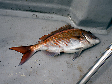 ヒットリグは「目ん玉オヤジ」グロー、13グラム。エビシャキ+ストロング棒のコラボ結果である。どれか一つ欠けても、釣れなかっただろうし、ましてや・・・・ん?くどい?あっ、そ〜。 続いてO柳君の竿に、先ほどまで一緒に居たジイ様を探していた孫の鯛が掛かったが、長男、長女、次女の鯛は遺産相続でもめていて、エビやイソメには見向きもしなかった。代わりにフグやサメが顔を出して、お仕置きされる始末。 こうして、終わりの12時を迎える。船長、思案の揚げ句「30分、延長戦をやりましょ」に「やったぁ〜」。しかし、世の中はそう甘くはない。カチカチと時計の音が聞こえそうなほど、シーンと静まり返ったまま、残り20分・・10分・・5、4、3、2・・1分となったところで、左舷中央にいたリョウ君にヒット! お父さんの指示を受けながら、海面まで上がってきた魚体に「オオォ〜!」のどよめきが・・・。うむ、この子、何かを持っている。 この日、午後便の予約が入っていないため(そりゃ、そ〜だ、予約が入ってれば、今頃、青森マリーナに居るはず)船長に提案してみた。「船代にいくらかプラスしてもう少し時間を長くしてくんない〜?」に「じゃぁ〜、2時半にしましょ」と、交渉は妥結。 残り1時間半でO笠原君に釣って貰いたくて、自分と釣り座を交代した。たいして状況が良くなることも無かったが、終了間際の午後2時23分(残り7分)。小鯛が彼にヒット。到底、納得してないが、ようやく納竿となった。 |