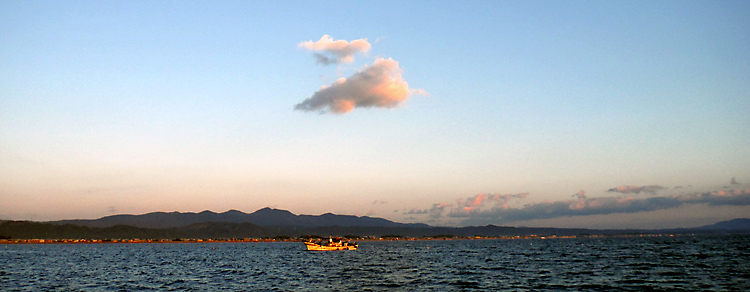 | 午前6時、ホタテ作業船が朝焼けでオレンジに輝いていた |
