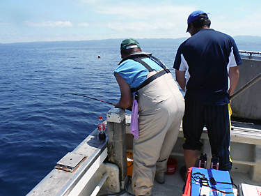 前日8日に竿を出したトハナ君から、冴えないメールが届いた。 今日は鯛夢さん、サワさん、自分と親分、それに初乗りの2名で合計6名の乗り合い。ところが集合時刻の4時になっても初乗り組が現れない。船長が電話すると10分遅れると返事があり待ったが、結局、30分遅れての到着となり、出船が遅くなった。遅刻は誰でもありうるので責める事はしないが、ひとこと言わせて貰えば「遅れてすみませんでした」ぐらいの言葉が欲しかった。それがマナーというものだろう。 今日もテンヤで勝負。餌はもちろんエビ。イソメは来年まで使わない。 潮は11時半方向にゆっくり流れている。船尾に陣取った我々(サワ、親分、自分)には、ちょっとだけ不利か。ただ、極端に横へ流れていないだけマシというもんだ。キャストを繰り返すが、釣れるのはフグばかり。それも忘れた頃に釣れる程度で、静かな時間が続いた。 もう残り1時間となった10時、中層から少し下にテンヤが差し掛かった時、ココッと来た。ぬ? (下に続く) |