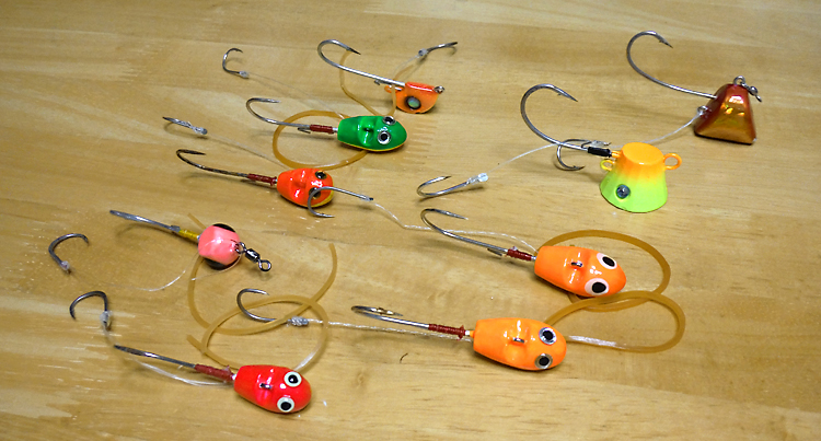| 本日のラインナップ。当初、3号前後(11g前後:左手前)を使っていたが、次第に潮が速くなったので、14g、17g、21gとなり、しまいには12号(45g:右側奥)になっていた | |