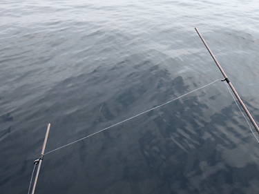 魚探には底から数m上に反応が出ていたが、逆らってベタ底に置いていたところ、コツコツとアタリ。 (下に続く) |