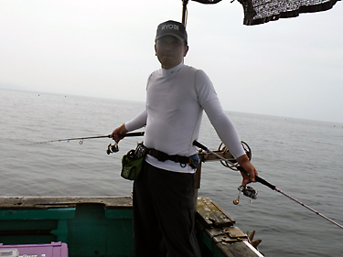 | 目ん玉オヤジ・パールホワイト11gが本日のヒットリグ。41mの底で食った | そしたら右隣の人がすぐ変えてヒット。ま、目ん玉オヤジの生みの親だから文句は言えない |