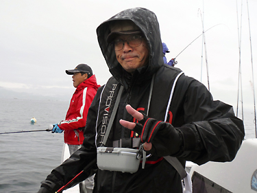 年に一度の大会「津軽んピック2016(オリンピックをもじって、こんな大会名になっている)」が今年もやってきた。超豪華な賞品が出るとあって、私も出てみたいとメールをくれる人が…今のところまだ居ないが(笑)、仲間内では最も盛り上がる大会である。 気になる天気予報だが、一週間前は「晴れ時々雨」に「ん〜、雨、イヤだなぁ〜」。 さて、当日はどうなったか? 午前5時、青森マリーナを出港するまでは何ともなかったのに、約1時間掛けて茂浦沖に着くと、待ってましたとばかり、ポツッ…ポツッ…ポツポツポツポツときた。ガガァ〜ン!なにょぉ〜、どこが昼前からだ?もう降ってきたジャン!気象台、責任者、出てこ〜い! そんな予報外れの雨に腹を立てていた中、黙々と釣り糸を垂れている静かで危険な男がいた。 公正さを期すため、1人の人間が計測したかったが、海佐知丸船長にはあまり面倒を掛けられないと思ったので、船首側6名はあすぱむ、船尾4名は船長が分かれて計測することで、一旦、話がついた。ところが、これがあとでちょっとした物議となった(笑)。 釣れる人には実に楽しそうなタイミングでヒットしてポンポン出るのだが、その他はほとんどが昼前まで厳しい釣りを強いられていた。時折、大粒の雨がぶつかると、あぁ〜、早上がりして浅虫温泉の温かい湯に浸かって、ビールをクイッとやるのも悪くないか、と心が折れかけた。 水深約50m。意外に潮が速い。事前に流した情報「3号まであれば何とかなります」がウソになりつつあった。これは皆さんに謝りたい。ゴメン。自分は昨年も速潮は経験済みなので、オプションでテンヤの上に重りを付ける等の対処は出来たが、皆さんははたしてどうだったものか?返ってくる答えが怖いので、敢えて夜の宴会の場では潮について話題にしなかった。 また、一週間ほど前までは青森湾内、良い情報が無く、一日一杯、真鯛狙いだと飽きてしまうだろうと他の船長も交えて、そんな話になったため、イソメの準備もお願いした。結果的にはイソメに手がつかないまま終わった方も出て、これもまた平身低頭、ゴメンなちゃいと謝るしかない。 (下に続く) |