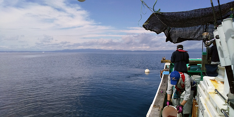 | 日差しが強くなり遮光ネットが登場。手動式ハイテク屋根は完成まで約15分。 噂では乗船客に女性がいると3秒で出来るらしい。さすが船長! 人を見る目は確かだ |
