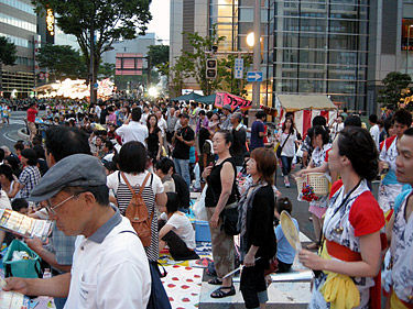 午後6時半、警官の誘導で、スタート地点にいよいよ移動開始。徐々に夕闇が迫り、ざわつき始めて、祭りの雰囲気も高まります。